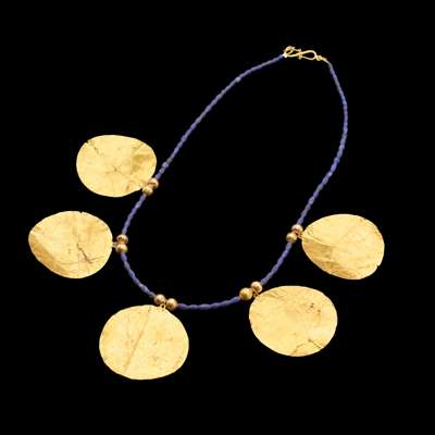 formed of lapis cyclindrical spacers with five gold-leaf circular pendants, strung with a modern s-hook closure