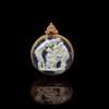 depicting the childhood of Bacchus surrounded by nymphs, on blue glass with rich iridescence, in gold frame with applied scrolling wirework detail, the top with inset agate