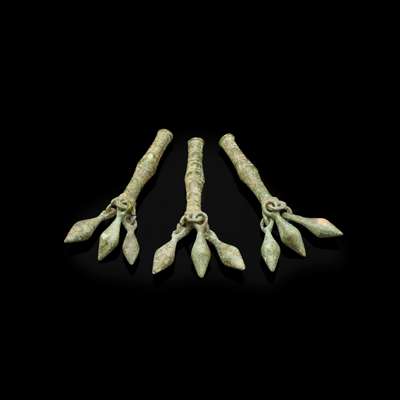 cut and hammered bronze, each pendant formed of a tubular bead with the lower end worked into three integral rings from which hang solid-cast bud-like pendants