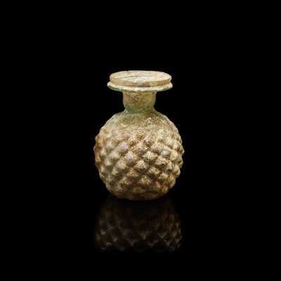 translucent pale green with areas of rich iridescence, the globular body with overlapping lozenge pattern of small raised knobs on a small concave base, leading to a short cylindrical neck with constriction at the base, ending in a rounded rim with a projecting folded flange