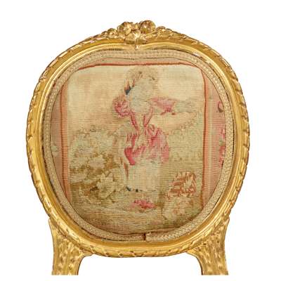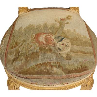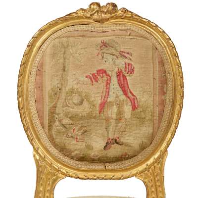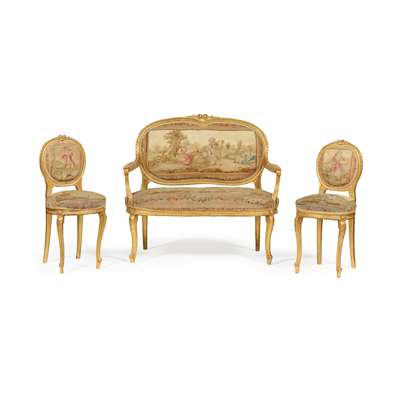 comprising a canapé and a pair of side chairs, the oval padded backs and shaped seats with Aubusson covers depicting courting couples and animals, in giltwood frames carved with flowers and ribbons and raised on bellflower carved cabriole legs ending in scrolled toes