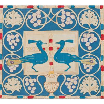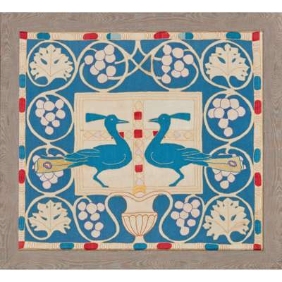 Note: Haslemere Peasant Industries was a community of artist craftsmen and women, established in Surrey in 1894 to obtain 'the double pleasure of lovely surroundings and happy work'. Ironwork, pottery, woodwork, fresco painting, hand-press printing, bookbinding, plasterwork and carving were all produced, but textiles were by far the industries' most important craft. The first weaving sheds were set up by Joseph and Maud King who specialised in handwoven plain and figured materials in linen, silk and cotton. From 1896 appliqué and embroideries, such as this example, were produced by the Peasant Arts Society founded by Godfrey Blount and his wife Ethel Hine. Local women were recruited for the workshops and trained in weaving and embroidery techniques.