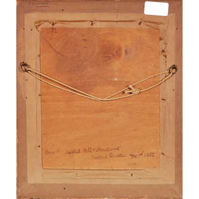 appliqué ‘fabric mosaic panel’, painted silk, bears inscription verso BOUGHT APPLIED ARTS & HANDIWORK VINCENT SQUARE, DECEMBER 1ST 1932