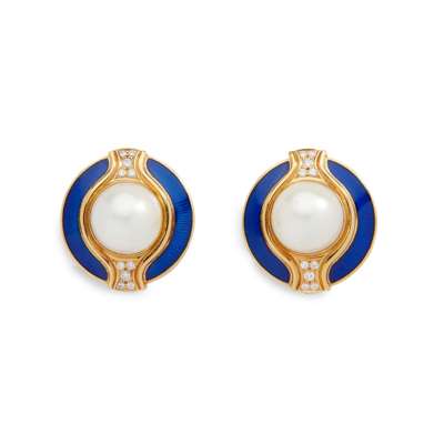 each of circular outline, set with a mabé pearl in a blue enamel border and round brilliant-cut diamond detail, to clip fittings, modelled in 18ct gold, signed de Vroomen