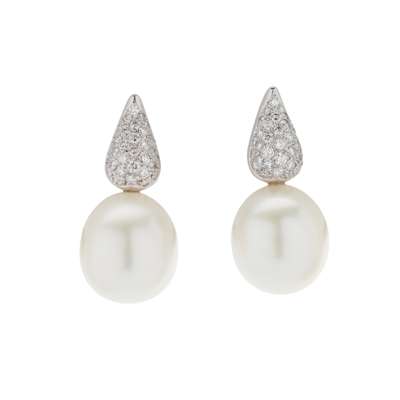 each modelled as a pavé-set diamond drop, suspending an ovoid South Sea pearl, to screw back fittings, unmarked