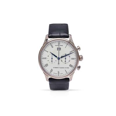 Chrono Grande Date model 02403, case with European convention mark for 18ct (white) gold, automatic movement, round white dial with Roman numerals in black, date aperture at 12, 30 minute register at 3, 12 hour register at 6, outer seconds track in black, blued steel hands, centre seconds hand, crown with logo and flanked by twin cylindrical push-buttons, exhibition caseback with serial number to edge, on a signed JD black leather crocodile-effect strap with signed clasp, in box, with outer box, with guarantee booklet (not completed by retailer)