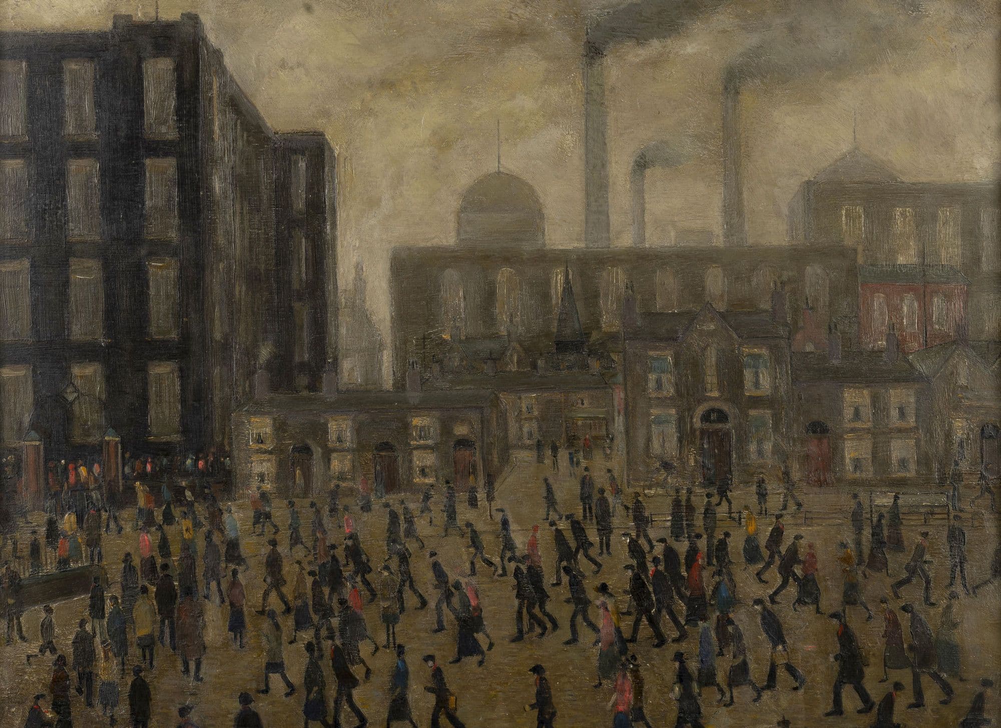Lowry’s paintings are never simple renditions of what he saw on the streets of his beloved city (or, more accurately, cities – Salford and Manchester). Works such as Going to the Mill are theatrical in their conception, which is why the ‘backdrop’ of the mill at Pendlebury repeats itself, often in altered configurations, throughout his works – such as the slightly later A Town Square, formerly in the Midland Bank collection, which sold at Sotheby’s in 2024. The city becomes a stage for an exploration of loneliness, isolation, loss, hope, although in Lowry’s hands the buildings themselves function as actors – figuring birth, marriage, death and the tyranny of mill-time, before, in later works, they are enveloped in an all-consuming white of Beckettian structure. Lowry was an inveterate theatre-goer who – intriguingly, instructively – cited both the 1920s ‘kitchen sink’ drama Hindle Wakes and Luigi Pirandello’s absurdist masterpiece Six Characters in Search of an Author as highly influential on his work. The breadth between these two plays indicates the breadth of Lowry’s conceptual framework for his apparently ‘simple’ painting. This conceptual reach, centred on the urban experience, is – as T. J. Clark argues so persuasively - what makes Lowry so relevant today, in our world of megalopolises, many of them growing at the same break-neck speed as Victorian Manchester once did.